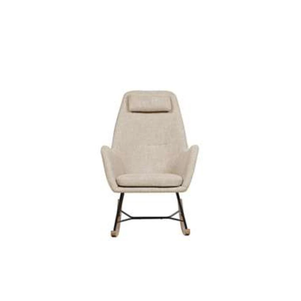 Moderne schommelfauteuil in lichtbeige. De klassieke schommelstoel, maar dan net even anders. Deze fauteuil combineert het concept van een klassieke schommelstoel met een moderne zitting. De stoel is comfortabel dankzij het extra kussentje als hoofdsteun en de zachte bekleding. De perfecte zetel om in de kinderkamer of voor de haard te zetten.