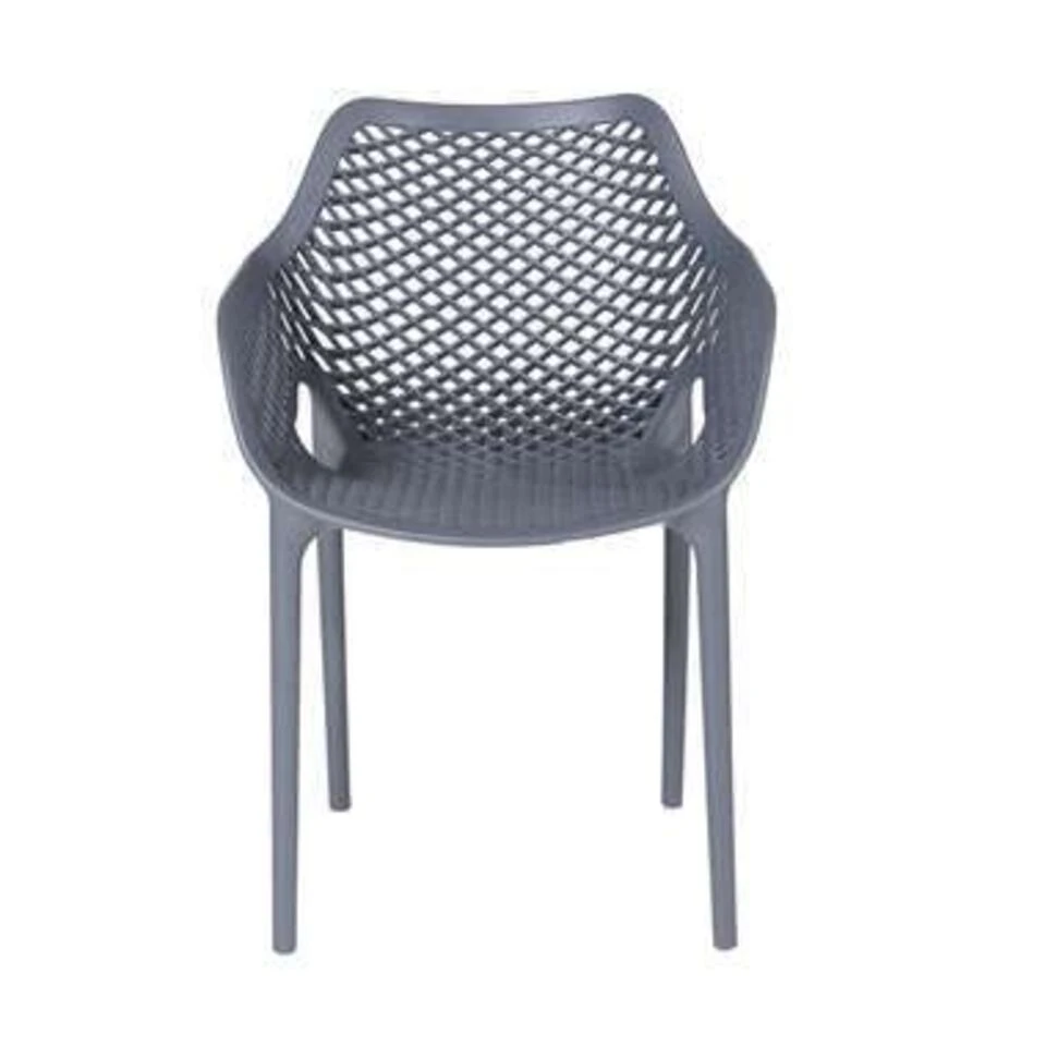Ben jij op zoek naar een mooie set kunststof tuinstoelen voor in de tuin óf in huis? Dan is de Air XL design tuinstoel donker grijs zeker een goede keuze. Deze hoogwaardige kunststof tuinstoelen van kwaliteitsmerk Garden Impressions zijn gemaakt van polypropyleen wat versterkt is met glasvezels. Deze stoelen zijn perfect te combineren met de robuuste tafel. Met de hippe Air XL dining fauteuils donker grijs kleed je je tuin snel sfeervol aan. De kunststof tuinstoelen zijn vervaardigd uit een onderhoudsvrije hoogwaardig kunststof. De tuinstoelen zijn voorzien van een hoog UV-filter waardoor de kleur wordt behouden. De collectie Air XL kunststof tuinstoelen zijn onderhoudsvrij en makkelijk schoon te maken met een kunststof reiniger en een zachte (pluisvrije) doek. De tuinstoelen zijn stapelbaar, wat het gemakkelijk maakt om op te bergen. In het ontwerp is rekening gehouden met regenwater, want door de subtiele gaatjes in de stoel loopt het regenwater meteen weg. De set van 2 Air XL tuinstoelen donker grijs hoef je niet te monteren, zo kan het genieten direct beginnen! De stoelen zijn voorzien van pootdopjes waardoor de onderkant van de poten niet zullen beschadigen. Technische specificaties: Afmeting dining fauteuil: B 56,5 x D 60 x H 81 cm, hoogwaardig polypropyleen met glasvezel, set van 2 Air XL tuinstoelen donker grijs.