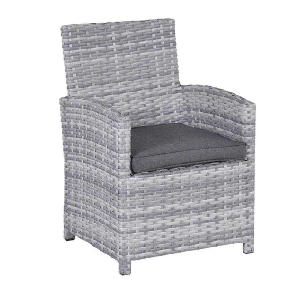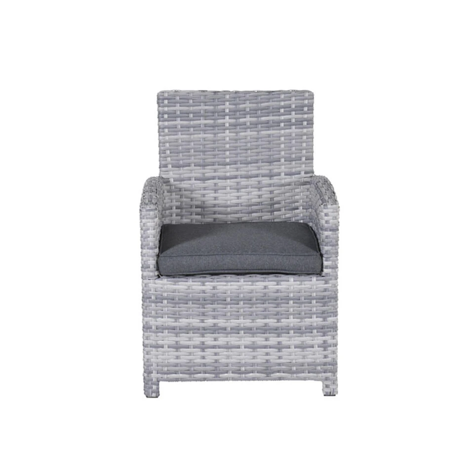 Het zitkussen is bovendien voorzien van een rits, waardoor het hoesje met de hand gewassen kan worden. Het kussen is niet waterbestendig en kan na gebruik worden opgeborgen in de schuur of kussenbox. Wel is het kussen voorzien van een waterafstotende coating. Dit is vooral erg praktisch als er bijvoorbeeld op het kussen wordt gemorst met drinken. Je veegt het vocht er namelijk gemakkelijk weer af. De Alaska dining fauteuil wordt volledig gemonteerd geleverd. De Alaska dining stoel is leverbaar in twee kleurstellingen en past perfect bij de Alaska lounge dining set.