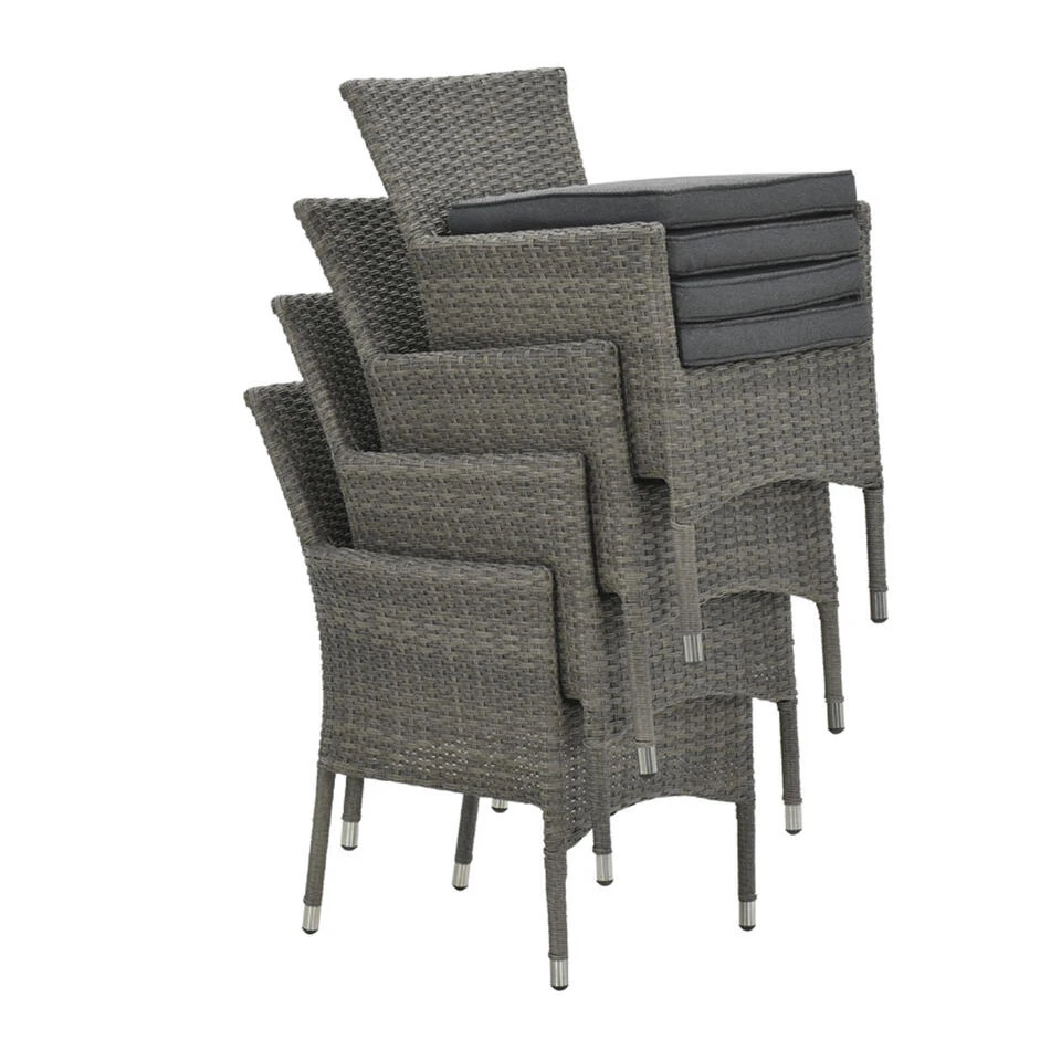 De vier Jerba tuinstoelen zijn gemaakt van een stevig aluminium binnen frame met daaromheen 7mm wicker vlechtwerkdraad in de kleur organic grey. Dit wicker is gemaakt van stevig kunststof waardoor de stoel zeer duurzaam is.