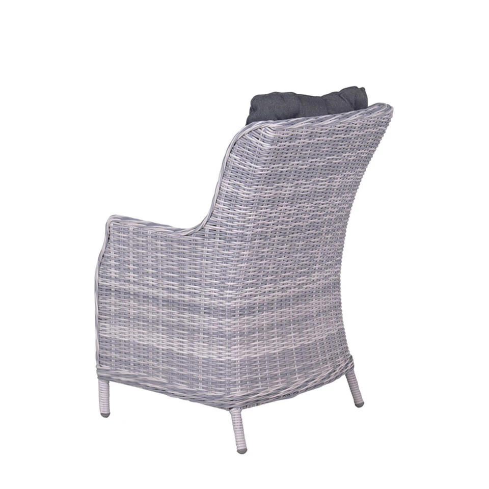 De extra comfortabele Marbella tuinstoel heeft een aluminium frame met daaromheen 5 mm halfrond vlechtwerkdraad in de kleur cloudy grey. De kleurschakeringen van het vlechtwerk en de mooie ronde afwerking geven deze tuinstoel een klassieke uitstraling. Deze luxe tuinstoel is 73 cm lang, 62 cm breed en 96,5 cm hoog. De Marbella stoel wordt geleverd inclusief comfortabele zit- en rugkussen in de kleur zwart. Ook de mooie afwerking van deze kussens dragen bij aan de klassieke look. De tuinstoel is erg onderhoudsvriendelijk. Met onderhoudsproducten speciaal voor vlechtwerk houdt u de kleur mooi en blijft het vlechtwerk de kwaliteit behouden.