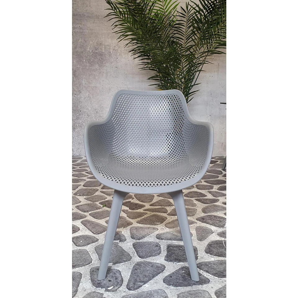 Deze tuinstoel van kunststof is volledig onderhoudsvrij en kan het hele jaar door buiten blijven staan. De kuipvormige zitting is comfortabel en dankzij de perforatie ook luchtig op warme dagen.